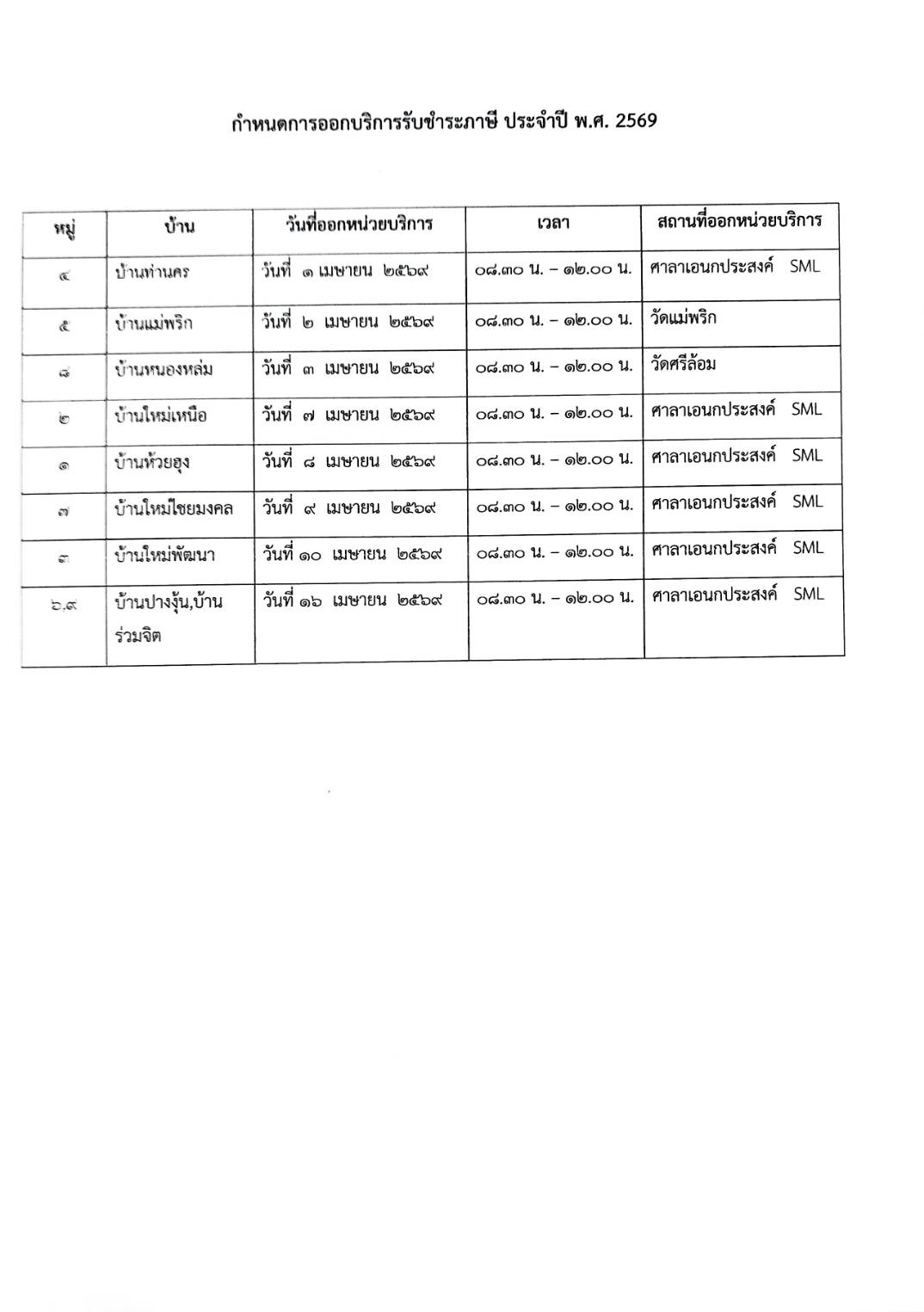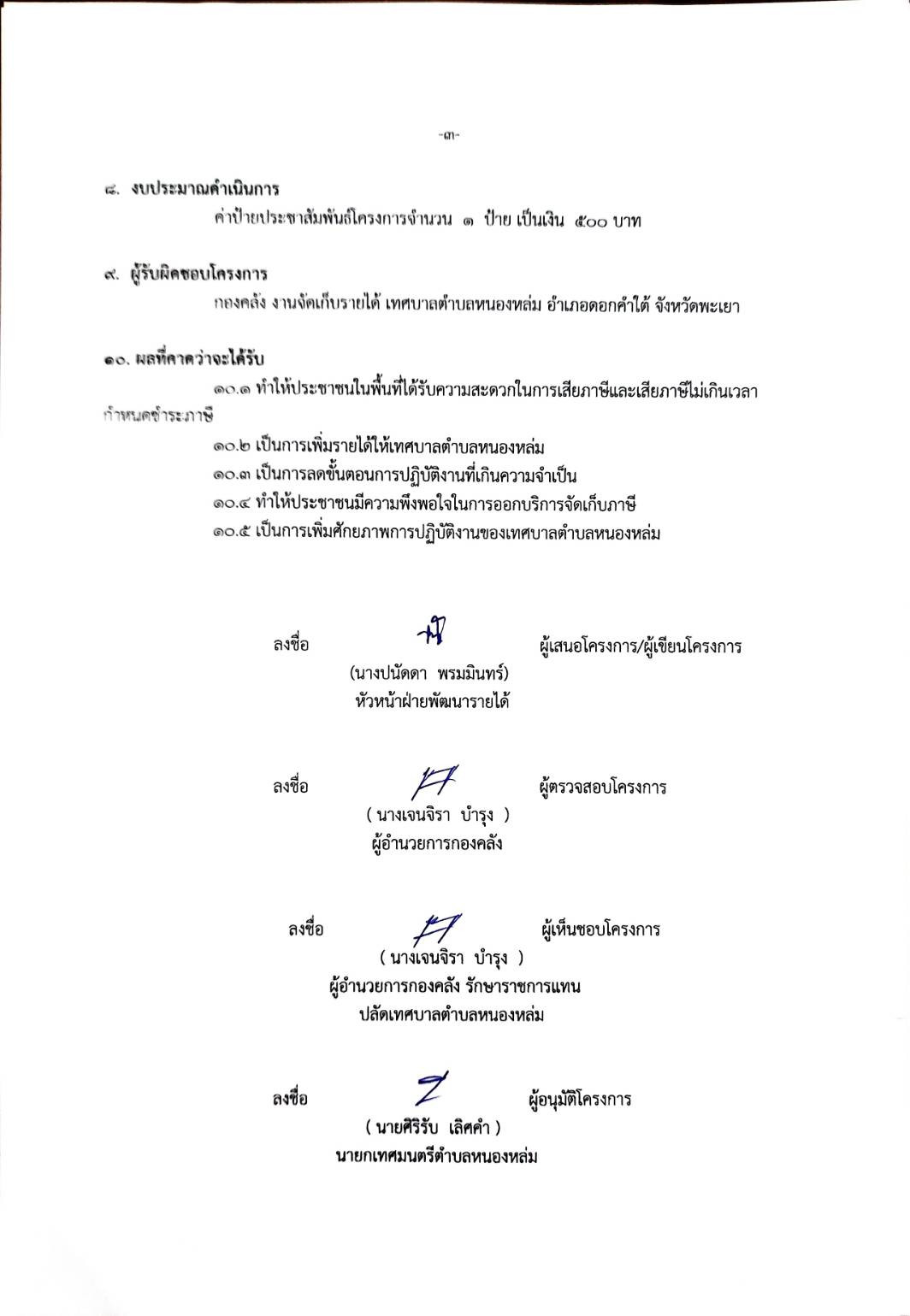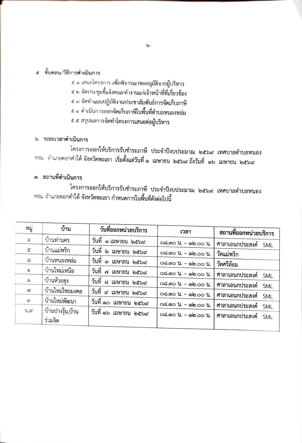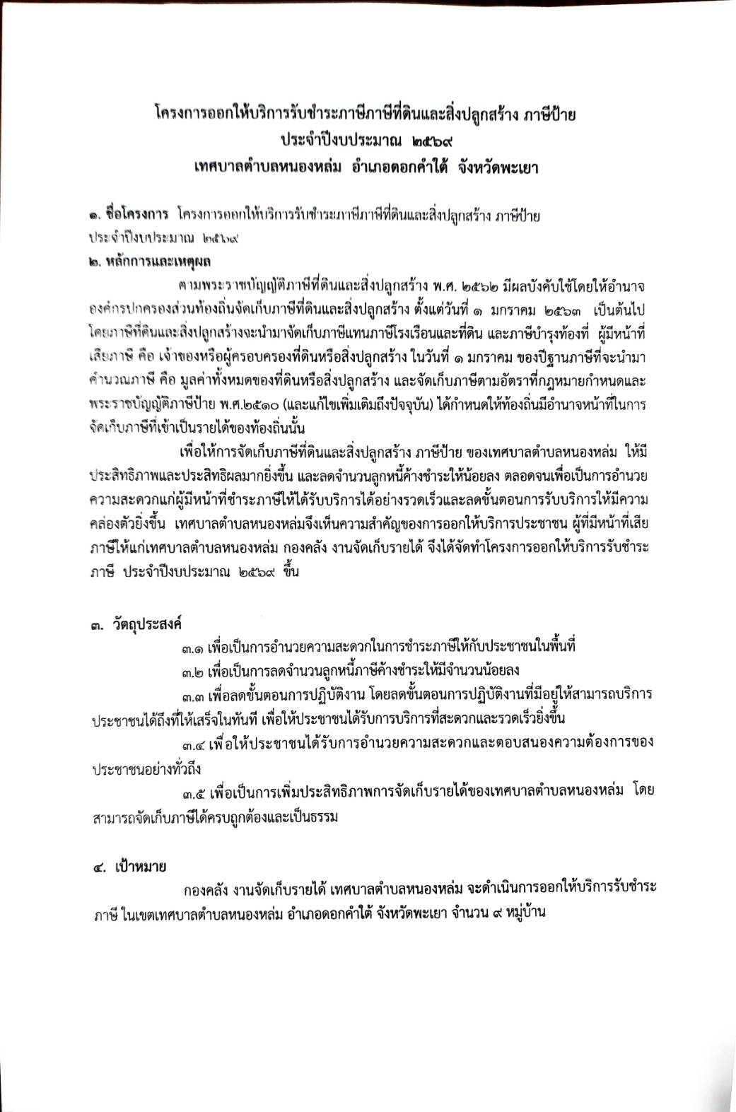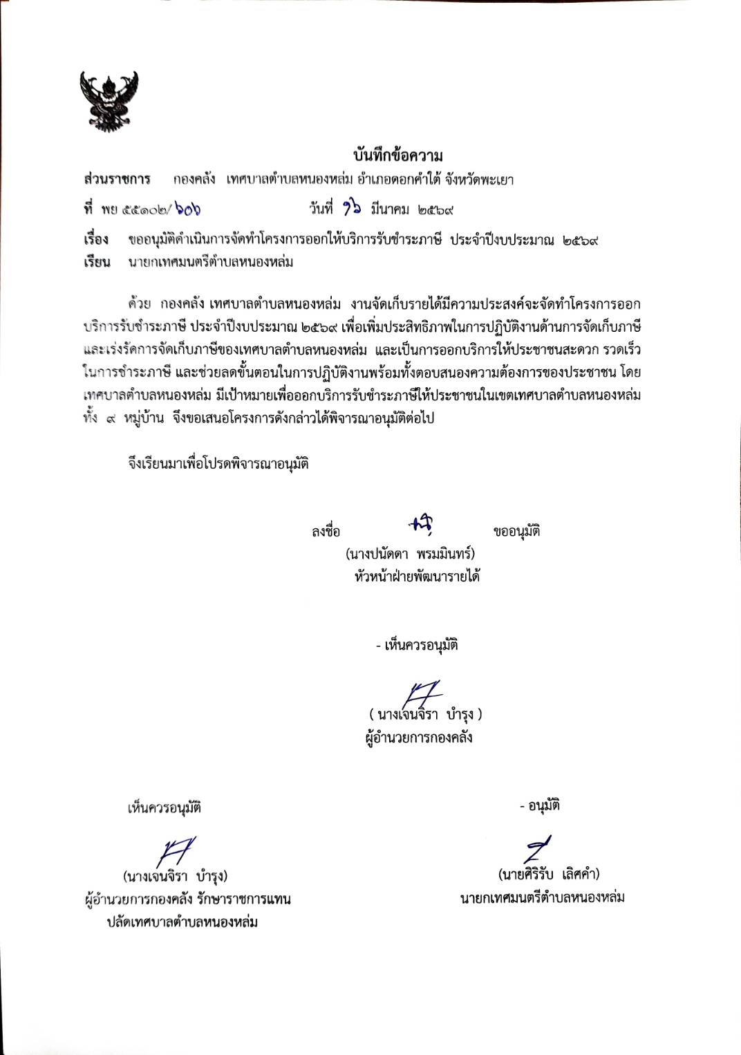 เรื่อง ขออนุมัติดำเนินการจัดทำโครงการออกให้บริการรับชำระภาษี ประจำปีงบประมาณ 2569 ????เพื่อเพิ่มประสิทธิภาพในการปฏิบัติงานด้านการจัดเก็บภาษีและเร่งรัดการจัดเก็บภาษีของเทศบาลตำบลหนองหล่ม ????เป็นการออกบริการให้ประชาชนสะดวด รวดเร็ว ในการชำระภาษี ????ช่วยลดขั้นตอนในการปฏิบัติงานพร้อมทั้งตอบสนองความต้องการของประชาชน ทั้ง 9 หมู่บ้าน ในเขตพื้นที่ตำบลหนองหล่ม