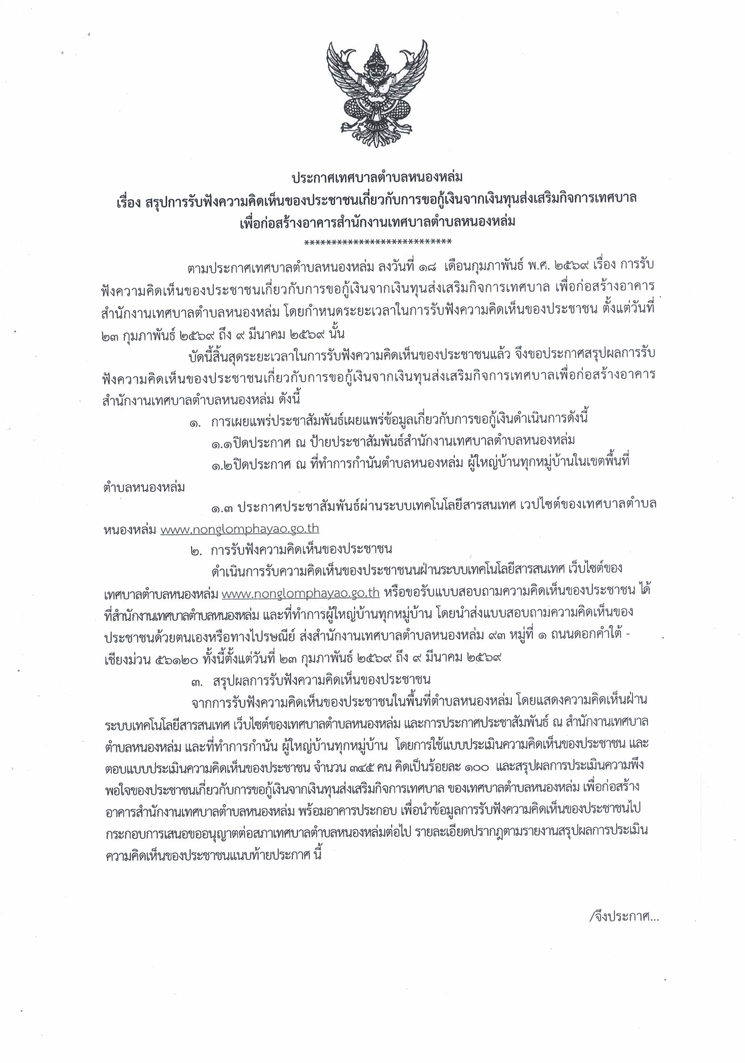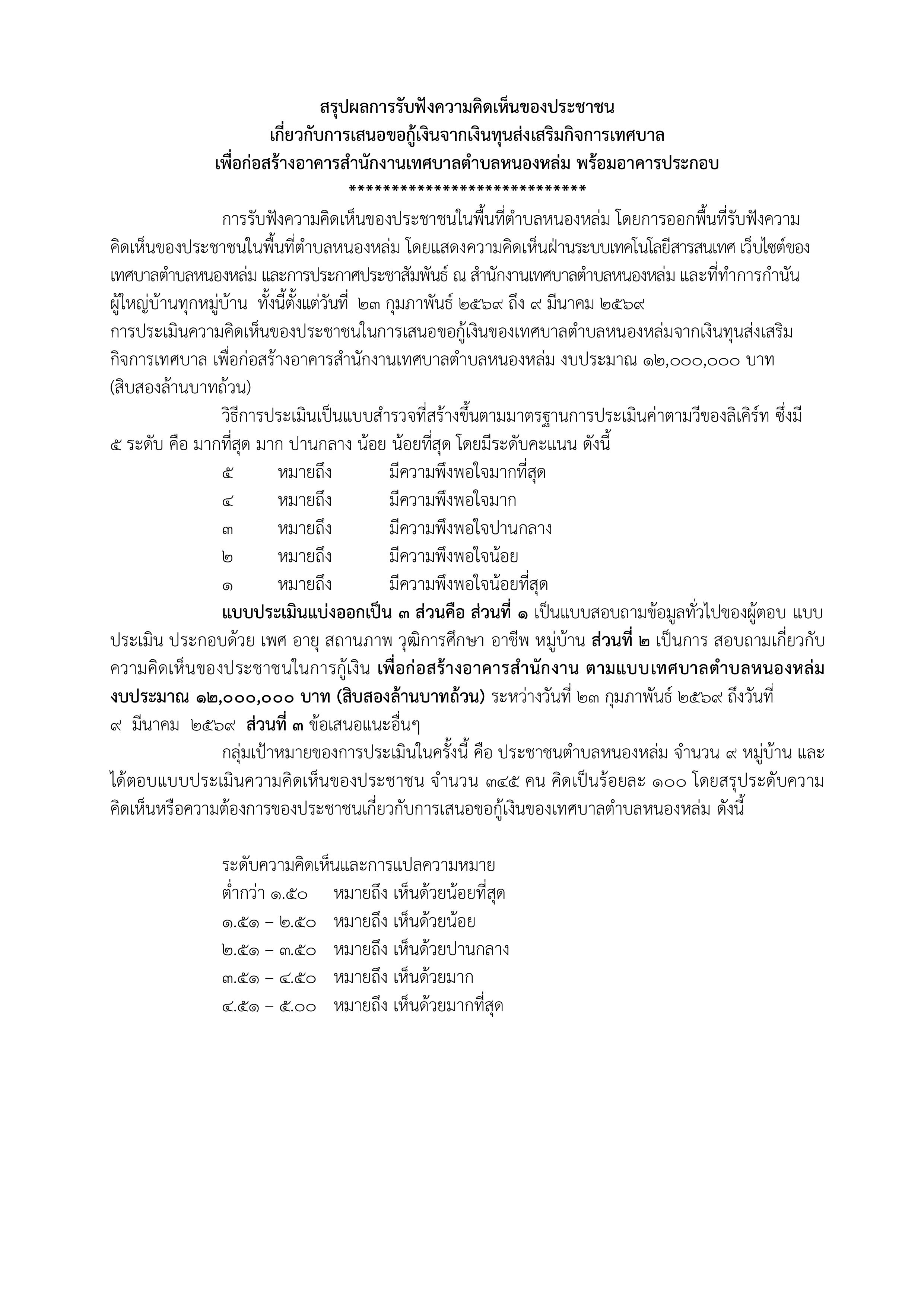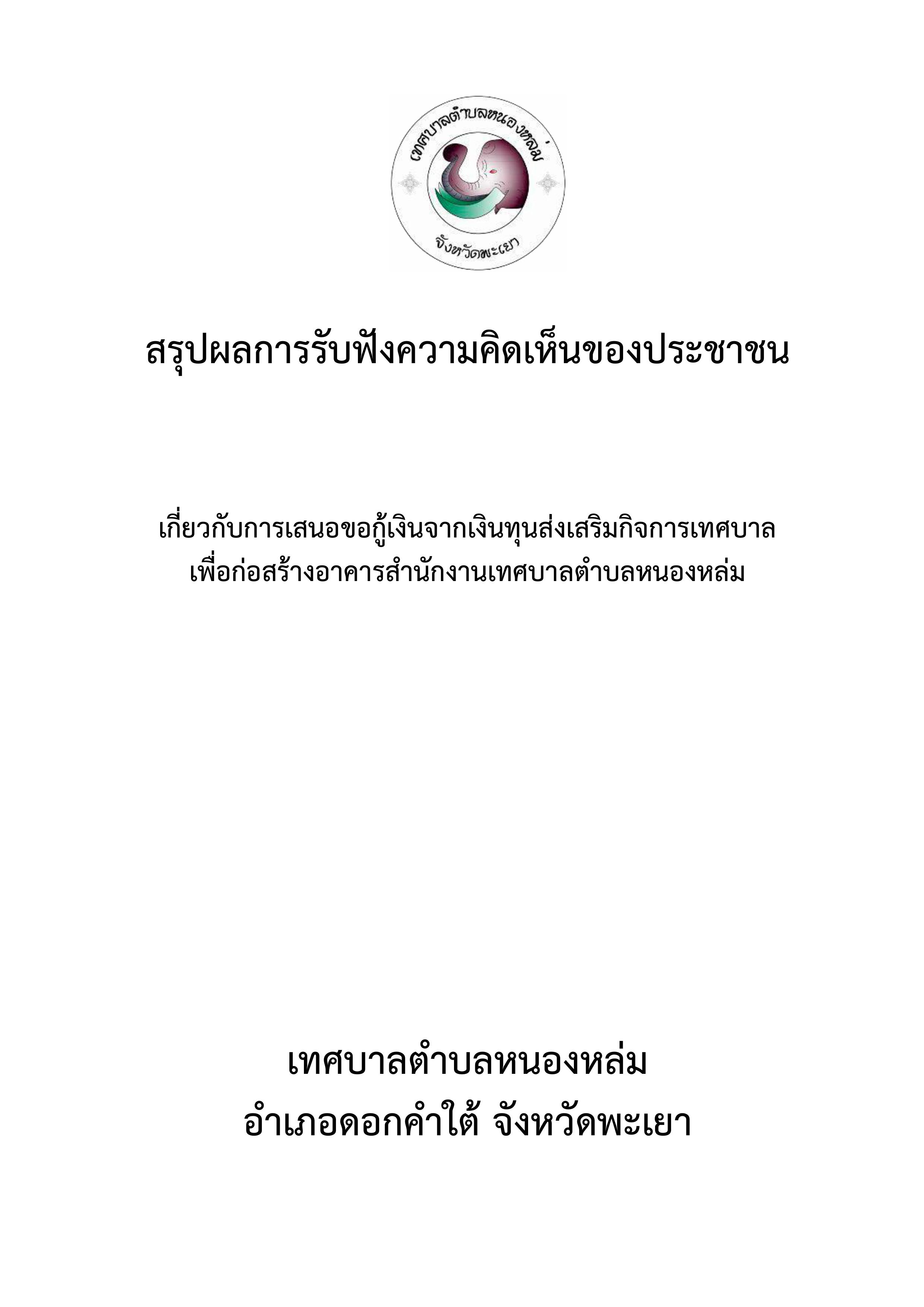 เรื่อง สรุปรับฟังความคิดเห็นประชาชนเกี่ยวกับการขอกู้เงินจากเงินทุนส่งเสริมกิจการเทศบาล เพื่อก่อสร้างอาคารสำนักงานเทศบาลตำบลหนองหล่ม