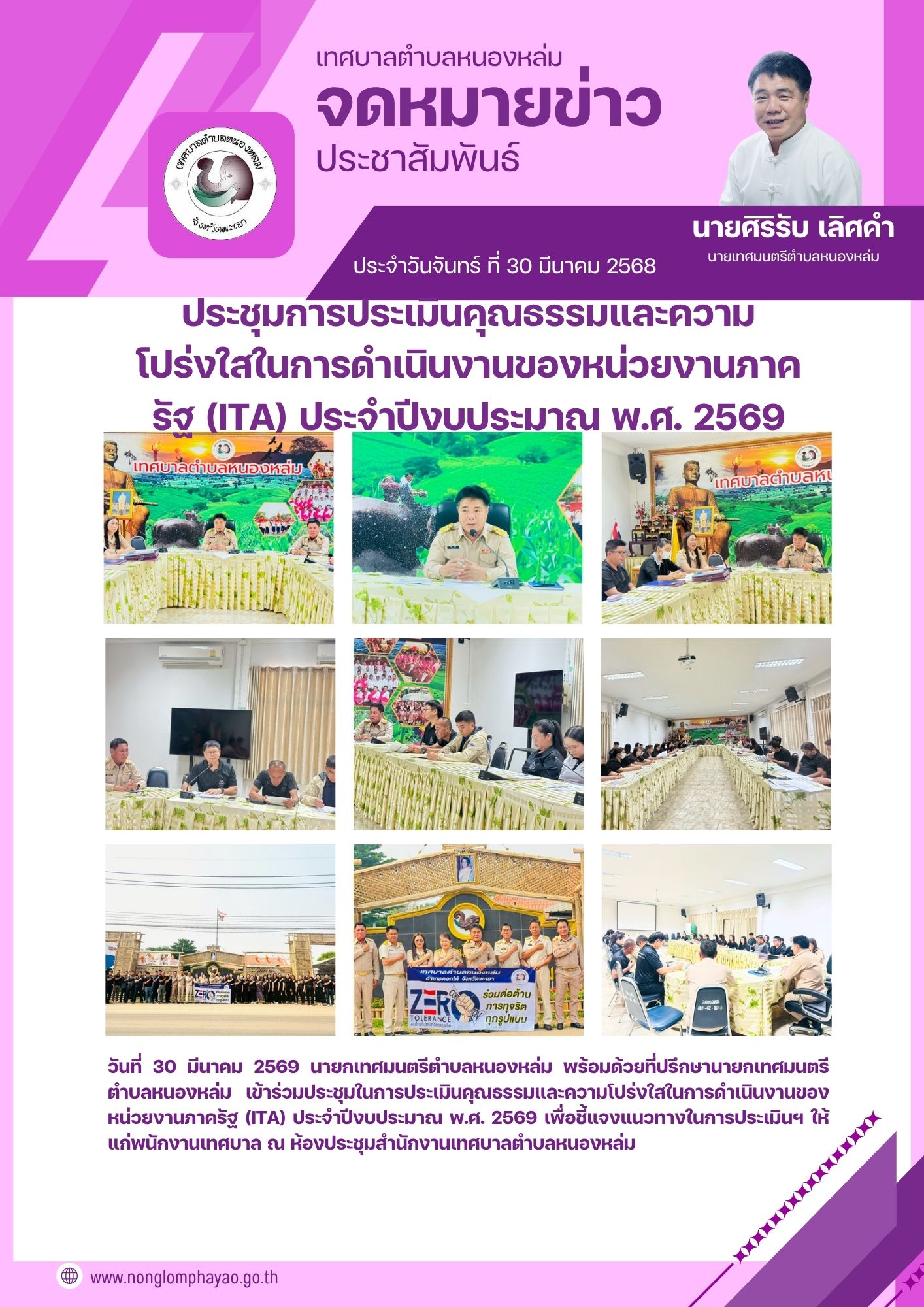 วันที่ 30 มีนาคม 2569 นายกเทศมนตรีตำบลหนองหล่ม พร้อมด้วยที่ปรึกษานายกเทศมนตรีตำบลหนองหล่่ม เข้าร่วมประชุมในการประเมินคุณธรรมและความโปร่งใสในการดำเนินงานของหน่วยงานภาครัฐ (ITA) ประจำปีงบประมาณ พ.ศ. 2569 เพื่อชี้แจงแนวทางในการประเมินฯ ให้แก่พนักงานเทศบาล ณ ห้องประชุมสำนักงานเทศบาลตำบลหนองหล่ม