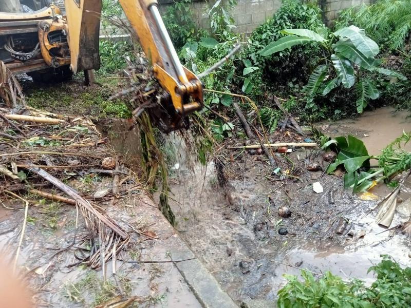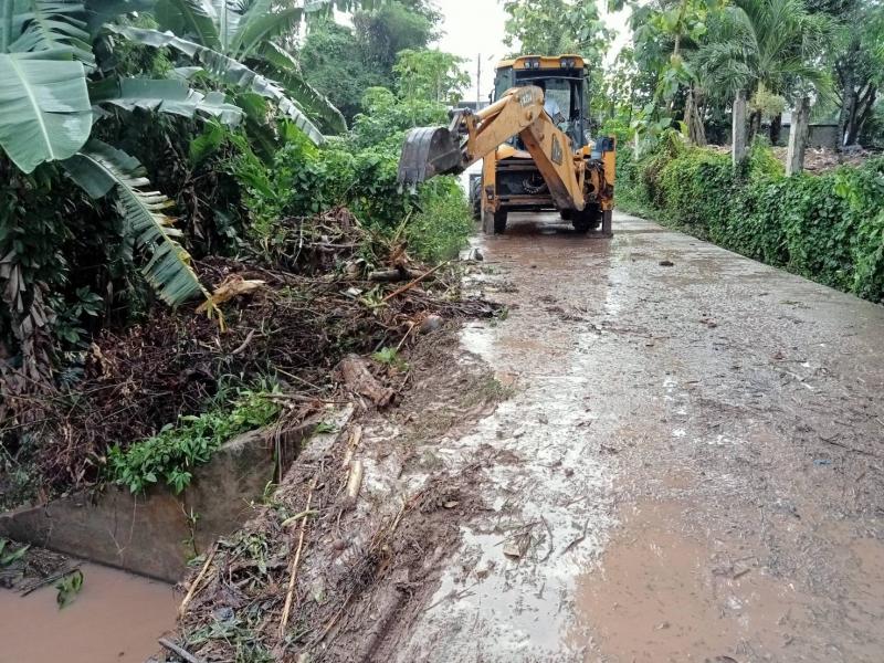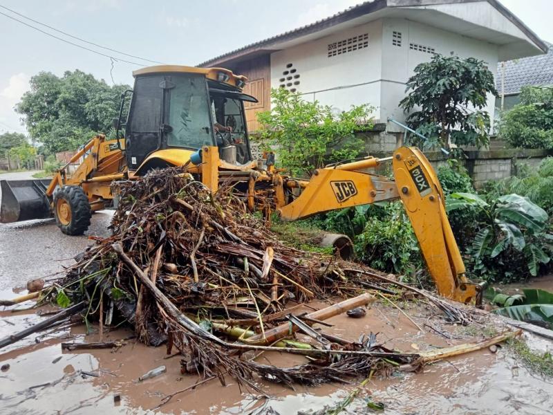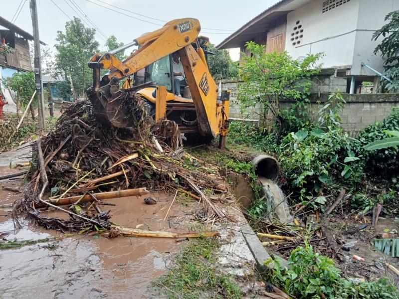 ขุดตักเศษสวะกิ่งไม้ที่ขวางทางน้ำออกจากสะพานบล็อคคอนเวิล์ด หน้า โรงเรียนบ้านหนองหล่ม หมู่ 8