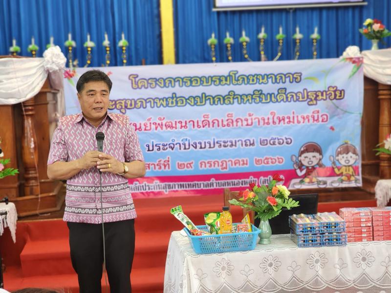 วันที่ 29 กรกฎาคม 2566 เวลา 09.00 น. นายศิริรับ เลิศคำ นายกเทศมนตรีตำบลหนองหล่ม เป็นประธานเปิดโครงการอบรมโภชนาการและสุขภาพช่องปากสำหรับเด็กปฐมวัย ประจำปีงบประมาณ 2566 พร้อมด้วยคณะผู้บริหาร สมาชิกสภาเทศบาล และงานศึกษา ร่วมกับ คณะครู ศพด.บ้านใหม่เหนือและประชาชนตำบลหนองหล่ม เข้าร่วมพิธีเปิด โดยมี นางสาวสุดารัตน์ จันทร์เฟย นักวิชาการสาธารณสุข และ นางสาวสุรัณณี เผ่ากันทะ โภชนากรชำนาญงานนักกำหนดอาหารวิชาชีพ เป็นวิทยากร ณ ศูนย์พัฒนาเด็กเล็กบ้านใหม่เหนือ ตำบลหนองหล่ม