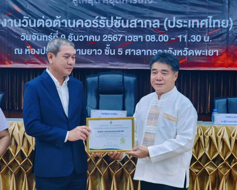วันที่ 9 ธันวาคม 2567 เวลา 10.30 น. นายศิริรับ เลิศคำ นายกเทศมนตรีตำบลหนองหล่ม เข้าร่วมงานวันต่อต้านคอร์รัปชั่นสากล (ประเทศไทย)และรับประกาศเกียรติคุณหน่วยงาน ที่มีผลการประเมินคุณธรรมและความโปร่งใส ในการดำเนินงานของหน่วยงานภาครัฐ ประจำปีงบประมาณ 2567 ซึ่งเทศบาลตำบลหนองหล่มได้รับผลคะแนน 89.67 ระดับ “ผ่านดี” โดยมีนายรัฐพล นราดิศร ผู้ว่าราชการจังหวัดพะเยา เป็นประธานมอบประกาศฯ ณ ห้องประชุมภูกามยาว ศาลากลางจังหวัดพะเยา