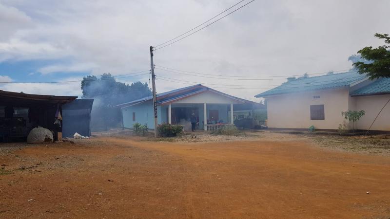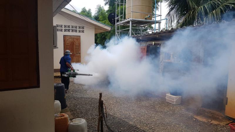 พ่นหมอกควันกำจัดยุงลายเพื่อป้องกันโรคไข้เลือดออก บ้านสันป่าม่วง หมู่ที่ 5