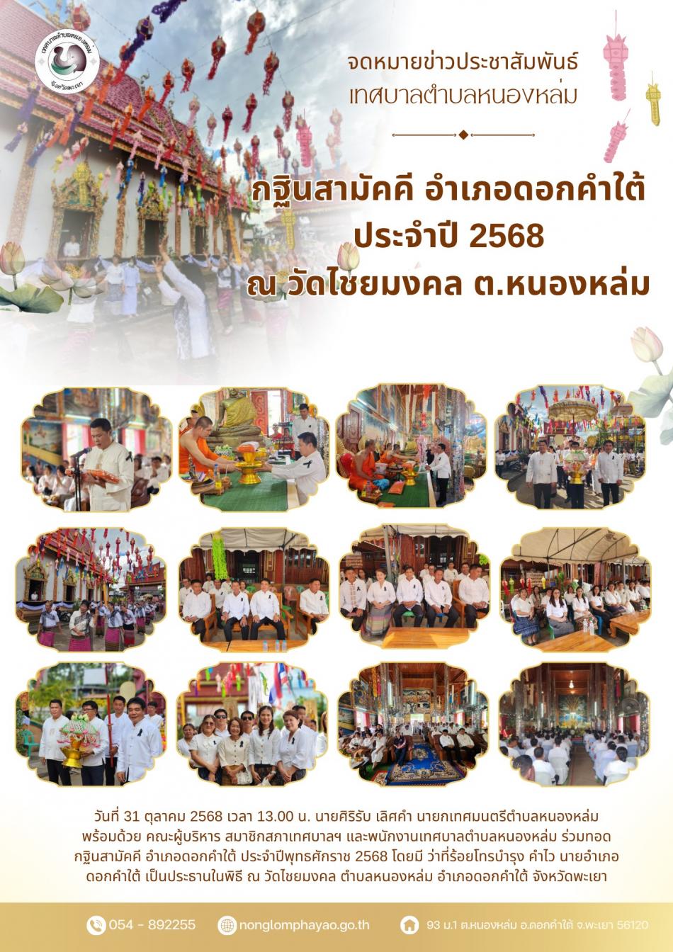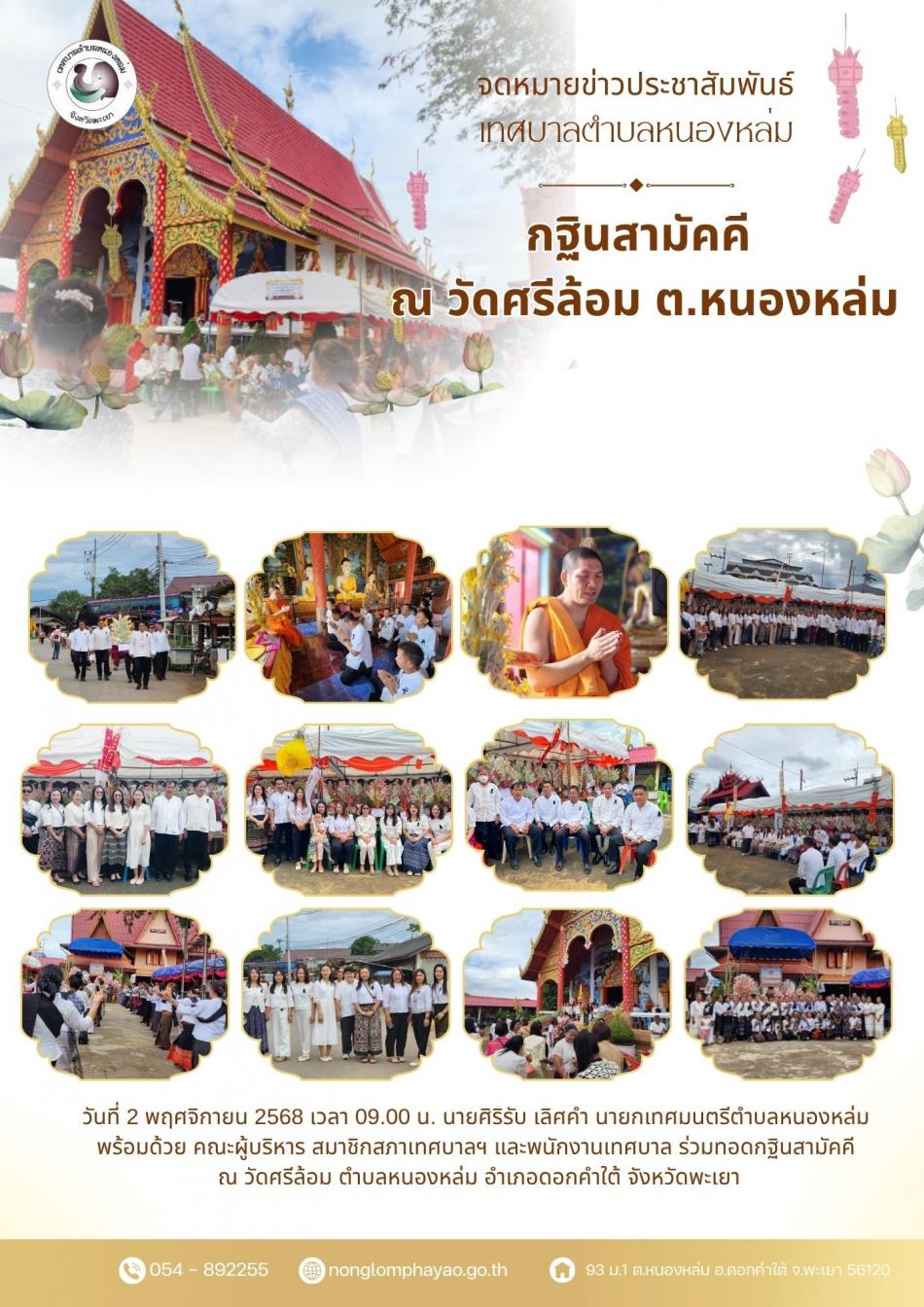 วันที่ 2 พฤศจิกายน 2568 เวลา 09.00 น. นายศิริรับ เลิศคำ นายกเทศมนตรีตำบลหนองหล่ม พร้อมด้วย คณะผู้บริหาร สมาชิกสภาเทศบาลฯ และพนักงานเทศบาล ร่วมทอดกฐินสามัคคี ณ วัดศรีล้อม ตำบลหนองหล่ม อำเภอดอกคำใต้ จังหวัดพะเยา [2 พฤศจิกายน 2568]