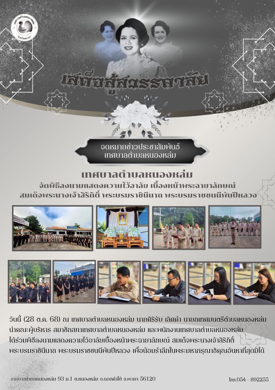 เทศบาลตำบลหนองหล่ม จัดพิธีลงนามแสดงความไว้อาลัย เบื้องหน้าพระฉายาลักษณ์ สมเด็จพระนางเจ้าสิริกิติ์ พระบรมราชินีนาถ พระบรมราชชนนีพันปีหลวง -------------------- วันนี้ (28 ต.ค. 68) ณ เทศบาลตำบลหนองหล่ม นายศิริรับ เลิศคำ... [28 ตุลาคม 2568]