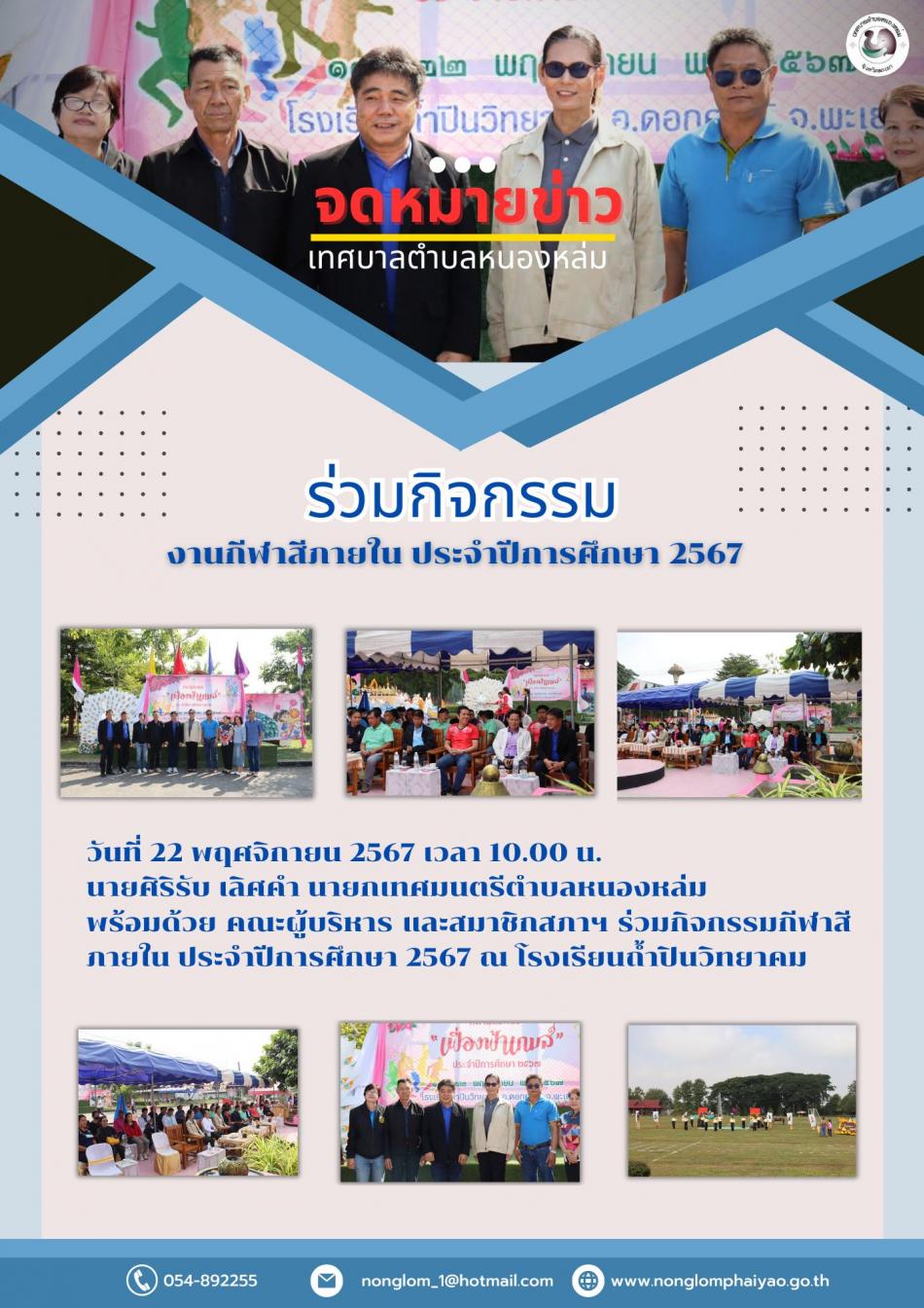 วันที่ 22 พฤศจิกายน 2567 เวลา 10.00 น. นายศิริรับ เลิศคำ นายกเทศมนตรีตำบลหนองหล่ม พร้อมด้วย คณะผู้บริหาร และสมาชิกสภาฯ ร่วมกิจกรรมกีฬาสีภายใน ประจำปีการศึกษา 2567 ณ โรงเรียนถ้ำปินวิทยาคม [22 พฤศจิกายน 2567]