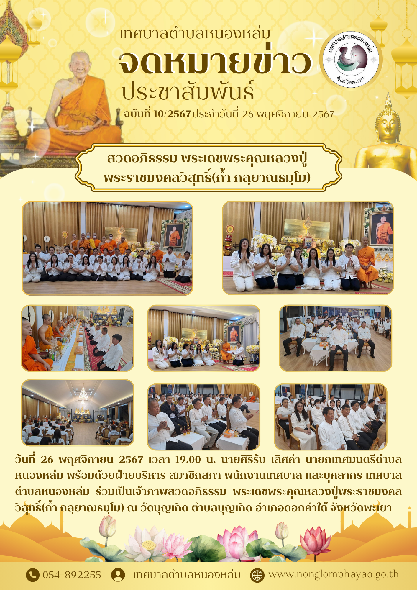 วันที่ 26 พฤศจิกายน 2567 เวลา 19.00 น. นายศิริรับ เลิศคำ นายกเทศมนตรีตำบลหนองหล่ม พร้อมด้วยฝ่ายบริหาร สมาชิกสภา พนักงานเทศบาล และบุคลากร เทศบาลตำบลหนองหล่ม ร่วมเป็นเจ้าภาพสวดอภิธรรม... [26 พฤศจิกายน 2567]