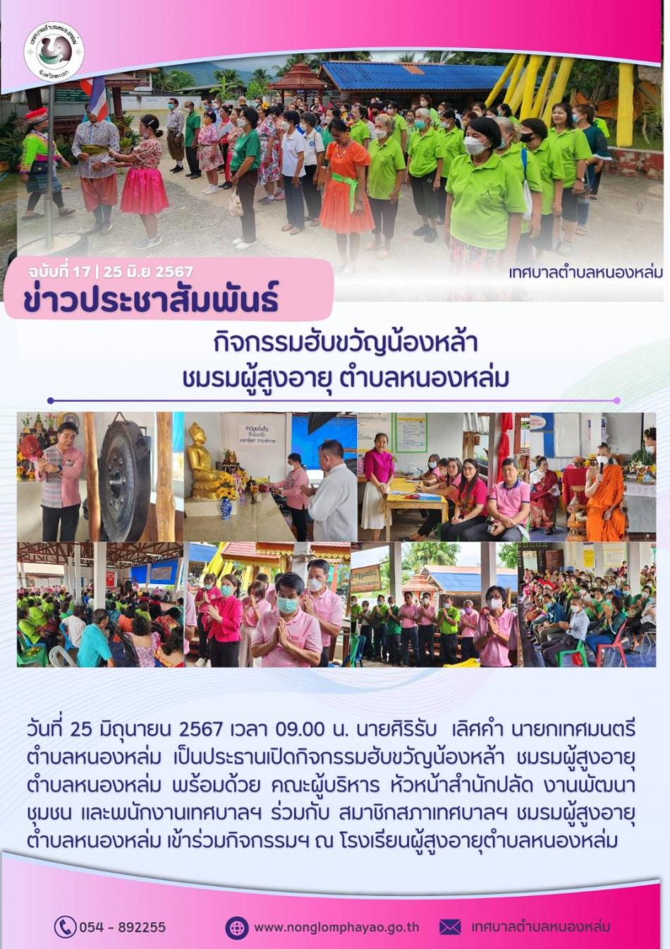 วันที่ 25 มิถุนายน 2567 เวลา 09.00 น. นายศิริรับ เลิศคำ นายกเทศมนตรีตำบลหนองหล่ม เป็นประธานเปิดกิจกรรม"ฮับขวัญน้องหล้า" ชมรมผู้สูงอายุ ตำบลหนองหล่ม พร้อมด้วย คณะผู้บริหาร หัวหน้าสำนักปลัด งานพัฒนาชุมชน และพนักงานเทศบาลฯ... [25 มิถุนายน 2567]