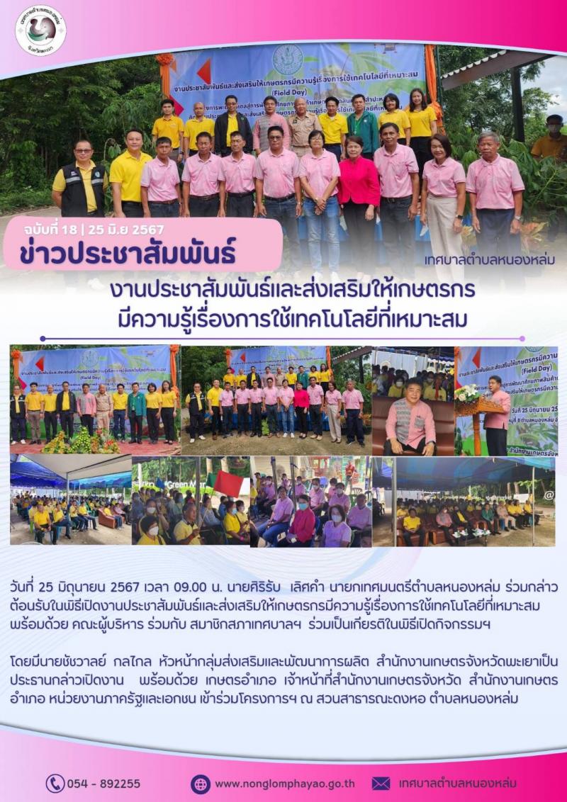 วันที่ 25 มิถุนายน 2567 เวลา 09.00 น. นายศิริรับ เลิศคำ นายกเทศมนตรีตำบลหนองหล่ม ร่วมกล่าวต้อนรับในพิธีเปิดงานประชาสัมพันธ์และส่งเสริมให้เกษตรกรมีความรู้เรื่องการใช้เทคโนโลยีที่เหมาะสม พร้อมด้วย คณะผู้บริหาร ร่วมกับ... [25 มิถุนายน 2567]