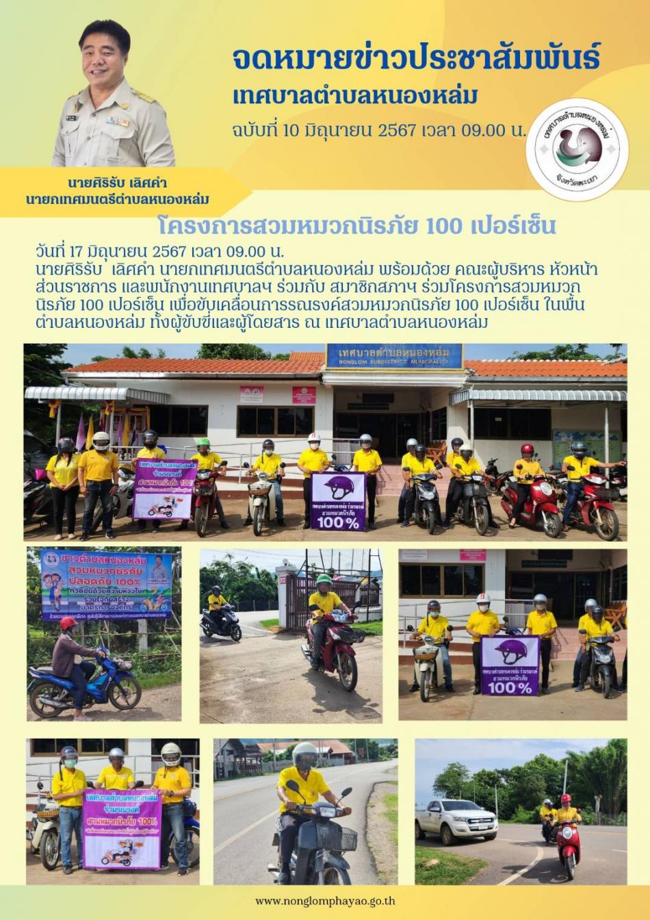 วันที่ 17 มิถุนายน 2567 เวลา 09.00 น. นายศิริรับ เลิศคำ นายกเทศมนตรีตำบลหนองหล่ม พร้อมด้วย คณะผู้บริหาร หัวหน้าส่วนราชการ และพนักงานเทศบาลฯ ร่วมกับ สมาชิกสภาฯ ร่วมโครงการสวมหมวกนิรภัย 100 เปอร์เซ็น... [17 มิถุนายน 2567]