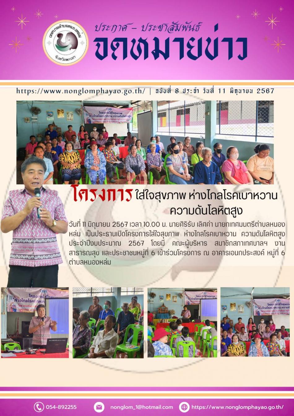 วันที่ 11 มิถุนายน 2567 เวลา 10.00 น. นายศิริรับ เลิศคำ นายกเทศมนตรีตำบลหนองหล่ม เป็นประธานเปิดโครงการใส่ใจสุขภาพ ห่างไกลโรคเบาหวาน ความดันโลหิตสูง ประจำปีงบประมาณ 2567 โดยมี คณะผู้บริหาร สมาชิกสภาเทศบาลฯ งานสาธารณสุข... [11 มิถุนายน 2567]