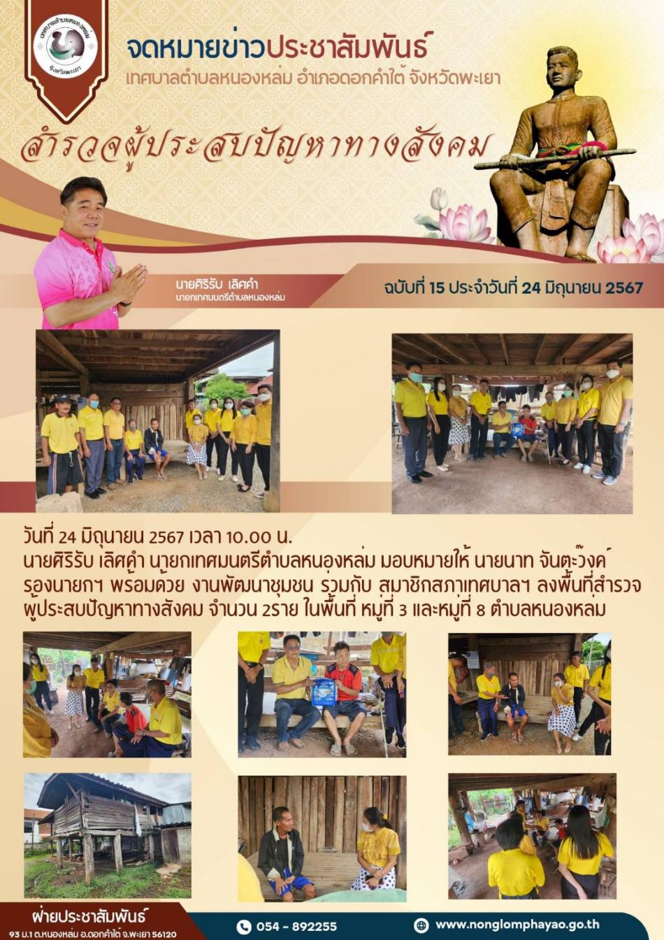 วันที่ 24 มิถุนายน 2567 เวลา 10.00 น. นายศิริรับ เลิศคำ นายกเทศมนตรีตำบลหนองหล่ม มอบหมายให้ นายนาท จันต๊ะวงค์ รองนายกฯ พร้อมด้วย งานพัฒนาชุมชน ร่วมกับ สมาชิกสภาเทศบาลฯ ลงพื้นที่สำรวจผู้ประสบปัญหาทางสังคม จำนวน 2ราย... [24 มิถุนายน 2567]