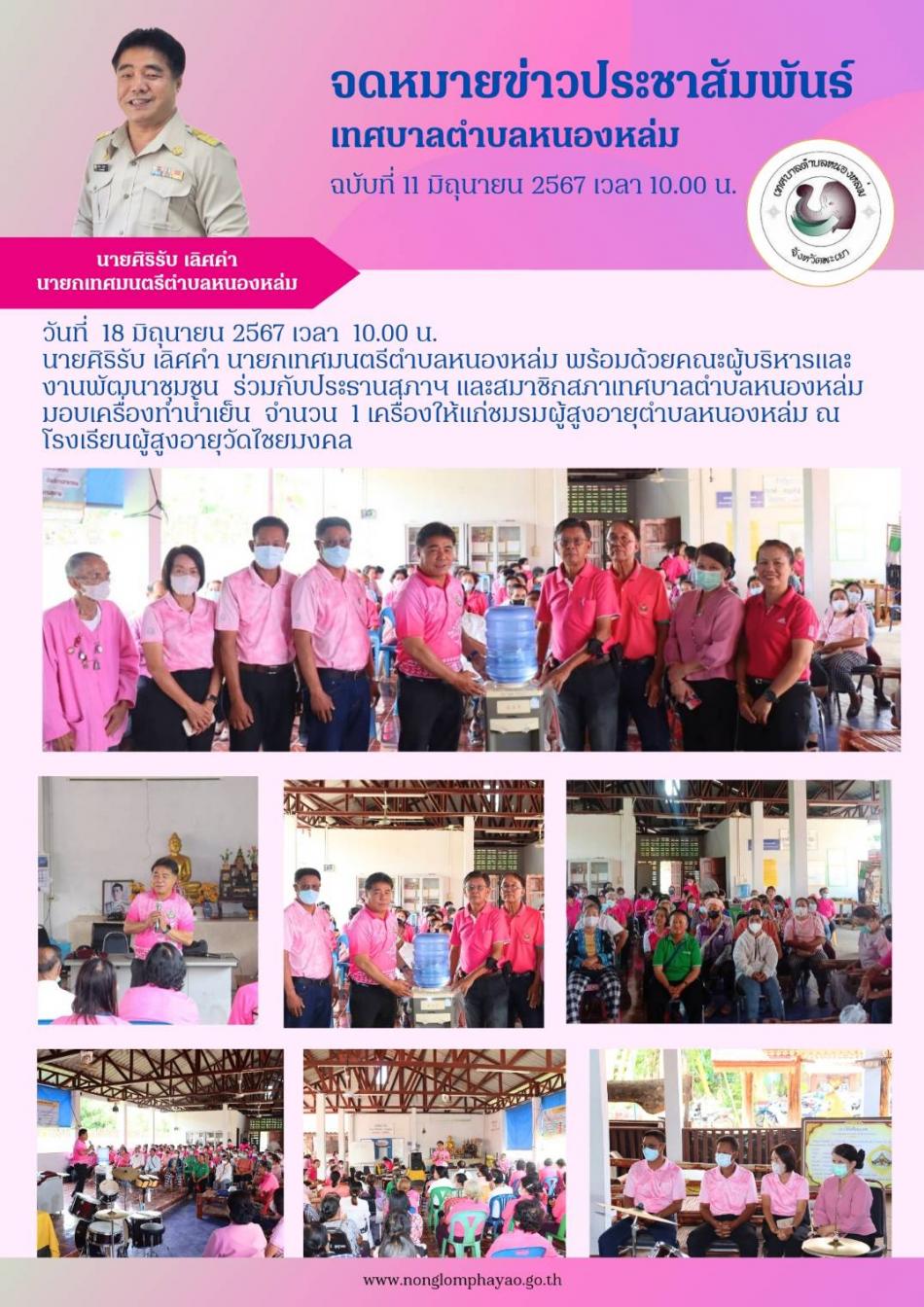 วันที่ 18 มิถุนายน 2567 เวลา 10.00 น. นายศิริรับ เลิศคำ นายกเทศมนตรีตำบลหนองหล่ม พร้อมด้วยคณะผู้บริหารและงานพัฒนาชุมชน ร่วมกับประธานสภาฯและสมาชิกสภาเทศบาลตำบลหนองหล่ม มอบเครื่องทำน้ำเย็น จำนวน 1... [18 มิถุนายน 2567]