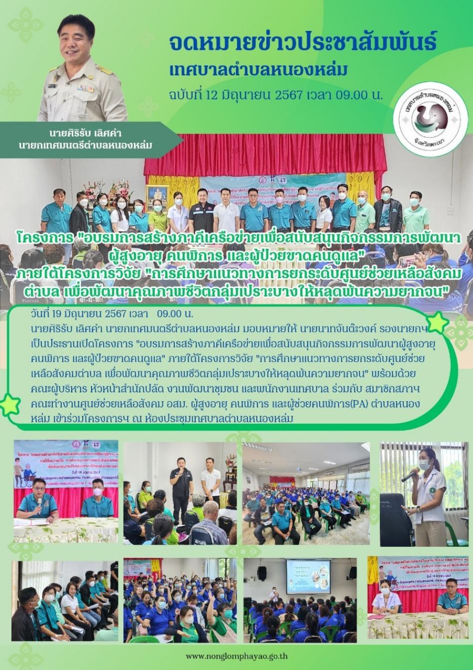 วันที่ 19 มิถุนายน 2567 เวลา 09.00 น. นายศิริรับ เลิศคำ นายกเทศมนตรีตำบลหนองหล่ม มอบหมายให้ นายนาทจันต๊ะวงค์ รองนายกฯ เป็นประธานเปิดโครงการ "อบรมการสร้างภาคีเครือข่ายเพื่อสนับสนุนกิจกรรมการพัฒนาผู้สูงอายุ คนพิการ... [19 มิถุนายน 2567]