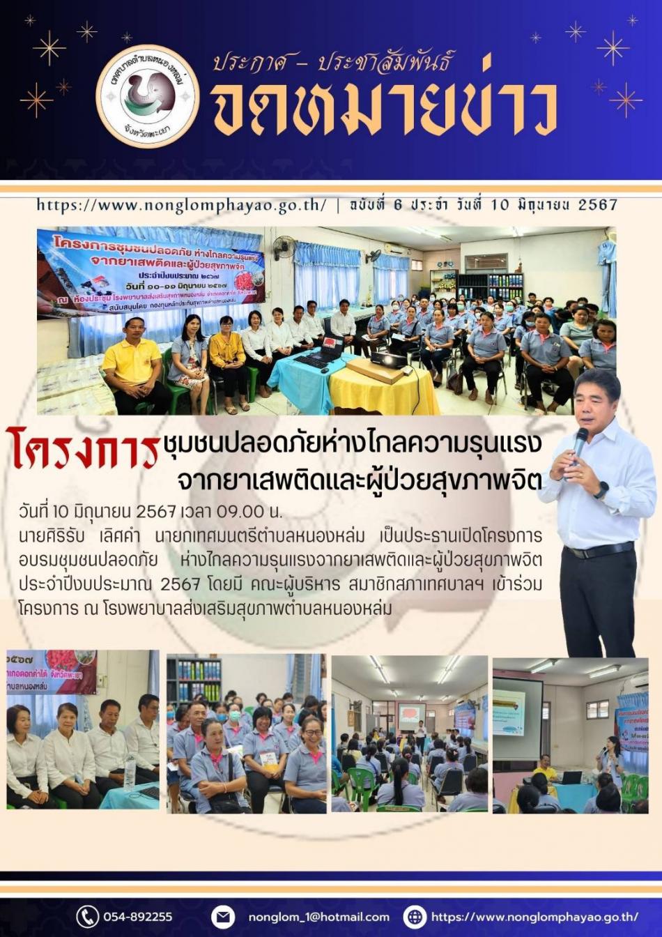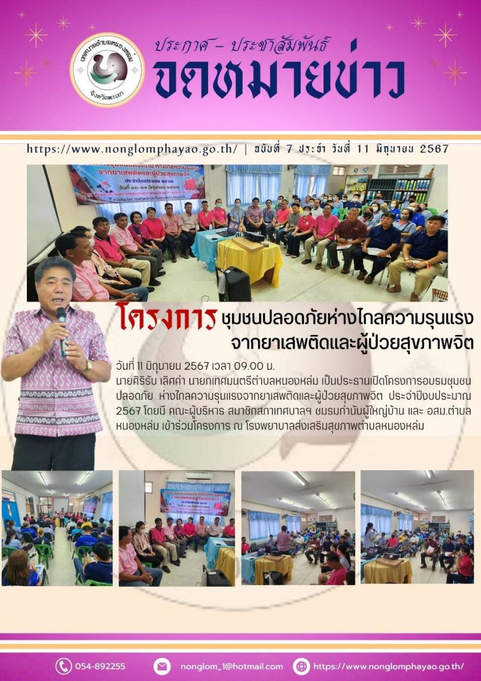 วันที่ 10 มิถุนายน 2567 เวลา 09.00 น. นายศิริรับ เลิศคำ นายกเทศมนตรีตำบลหนองหล่ม เป็นประธานเปิดโครงการอบรมชุมชนปลอดภัย ห่างไกลความรุนแรงจากยาเสพติดและผู้ป่วยสุขภาพจิต ประจำปีงบประมาณ 2567 โดยมี คณะผู้บริหาร... [10 มิถุนายน 2567]