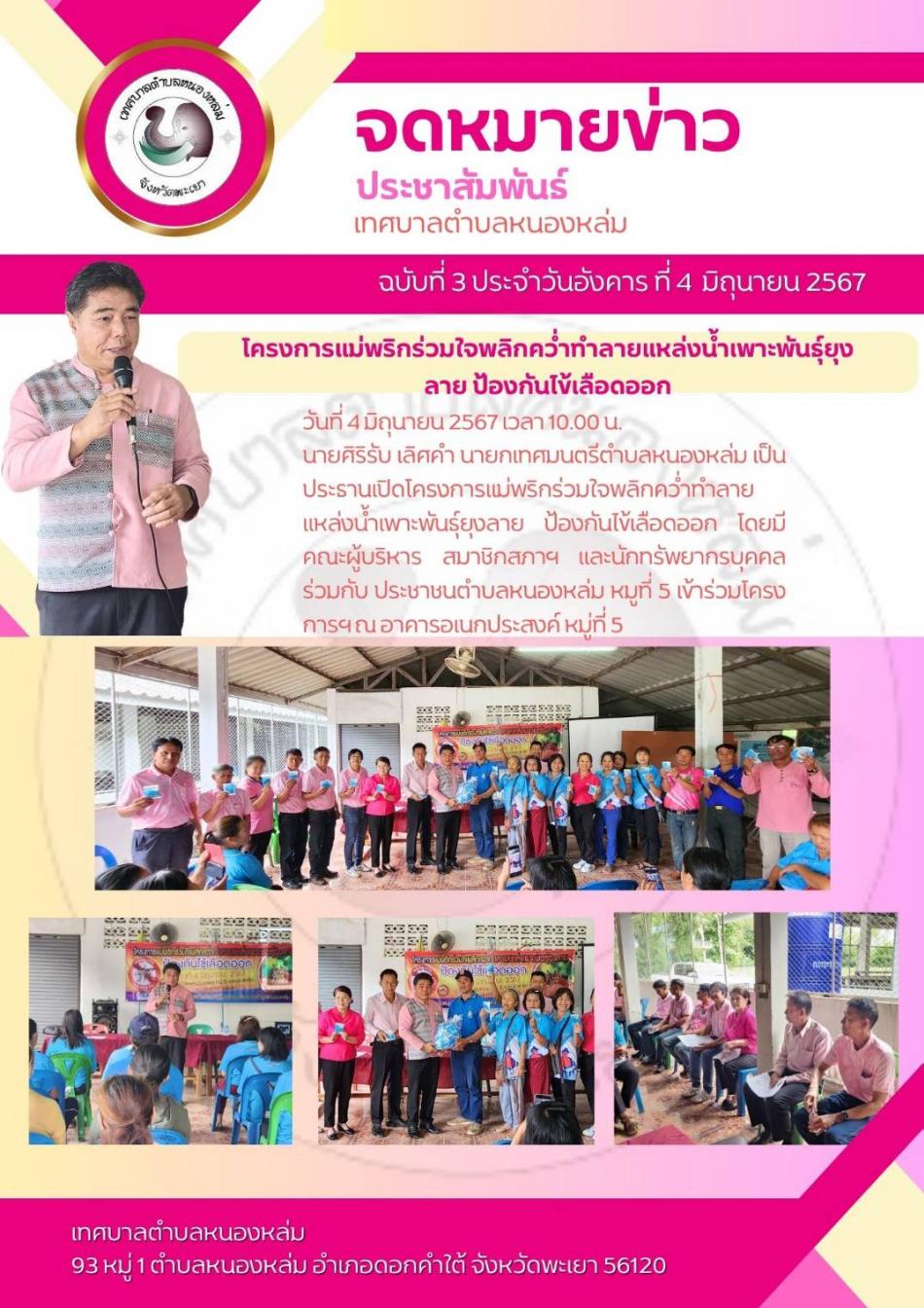 วันที่ 4 มิถุนายน 2567 เวลา 10.00 น. นายศิริรับ เลิศคำ นายกเทศมนตรีตำบลหนองหล่ม เป็นประธานเปิดโครงการแม่พริกร่วมใจพลิกคว่ำทำลายแหล่งน้ำเพาะพันธุ์ยุงลาย ป้องกันไข้เลือดออก โดยมี คณะผู้บริหาร สมาชิกสภาฯ... [4 มิถุนายน 2567]