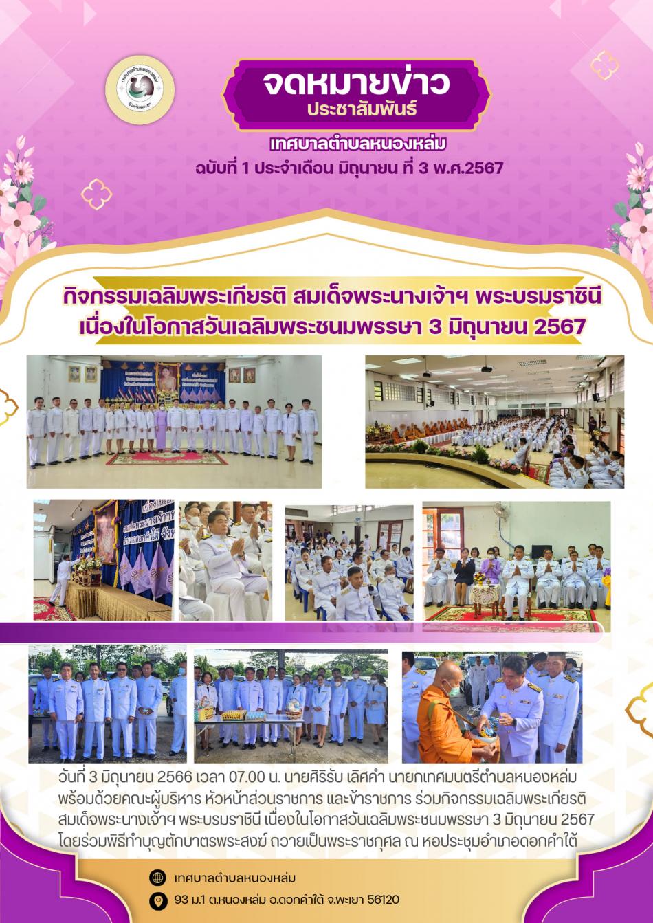 วันที่ 3 มิถุนายน 2566 เวลา 07.00 น. นายศิริรับ เลิศคำ นายกเทศมนตรีตำบลหนองหล่ม พร้อมด้วยคณะผู้บริหาร หัวหน้าส่วนราชการ และข้าราชการ ร่วมกิจกรรมเฉลิมพระเกียรติ สมเด็จพระนางเจ้าฯ พระบรมราชินี... [3 มิถุนายน 2567]