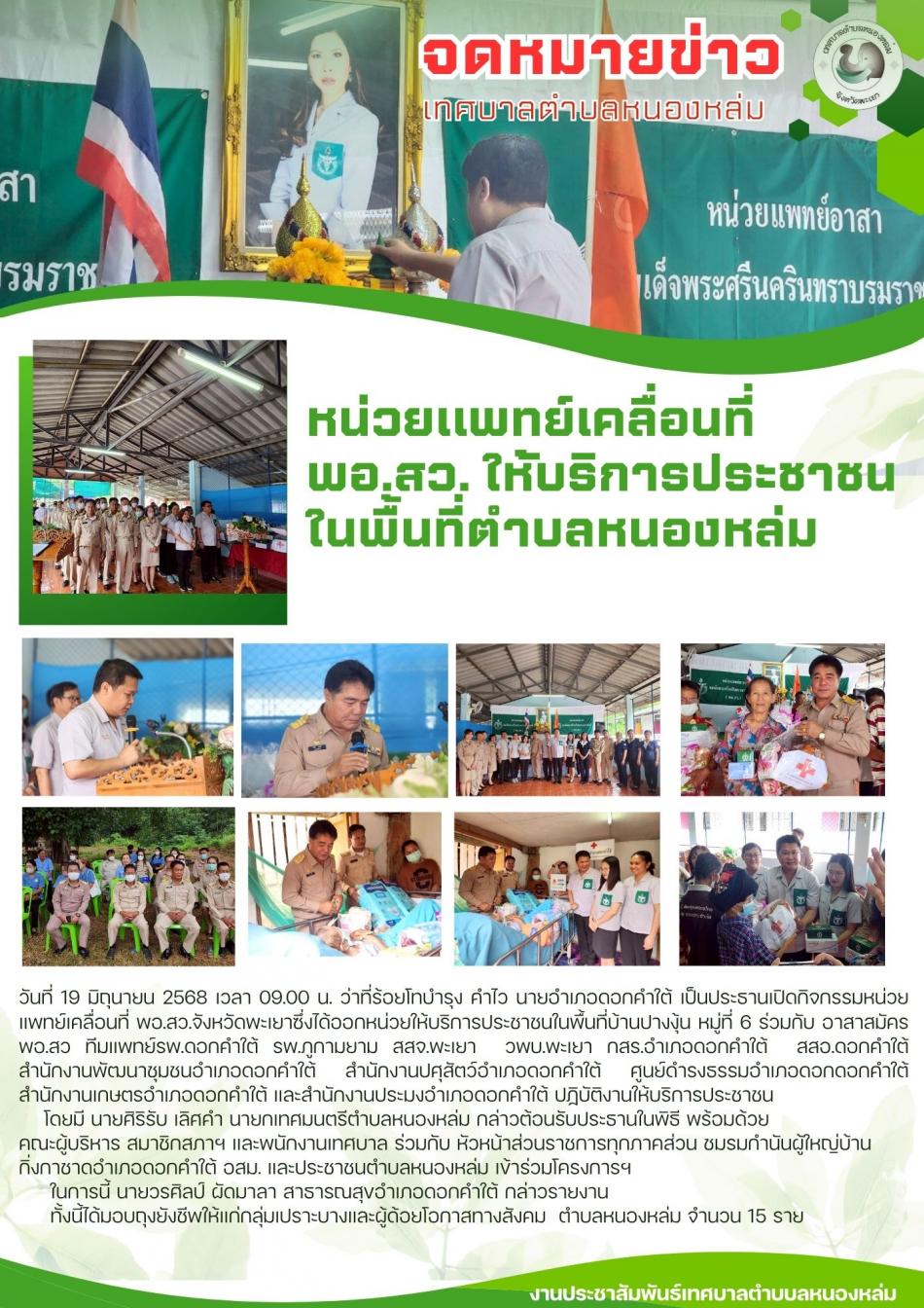 วันที่ 19 มิถุนายน 2568 เวลา 09.00 น. ว่าที่ร้อยโทบำรุง คำไว นายอำเภอดอกคำใต้ เป็นประธานเปิดกิจกรรมหน่วยแพทย์เคลื่อนที่ พอ.สว.จังหวัดพะเยาซึ่งได้ออกหน่วยให้บริการประชาชนในพื้นที่บ้านปางงุ้น หมู่ที่ 6 ร่วมกับ อาสาสมัคร... [19 มิถุนายน 2568]