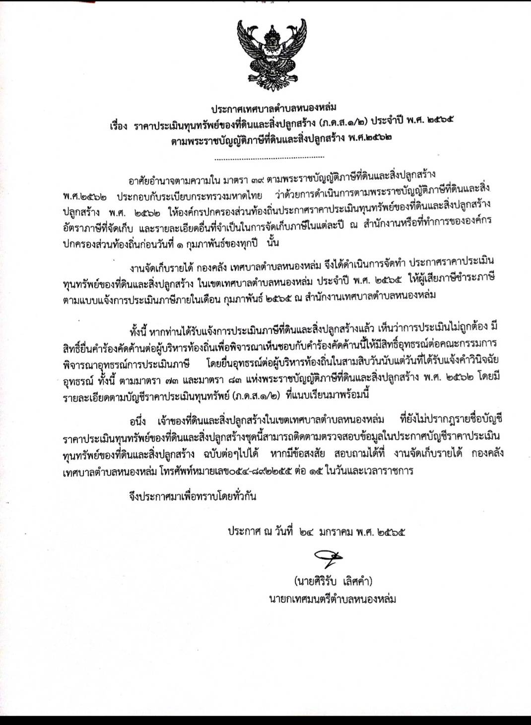 ประกาศราคาประเมินทุนทรัพย์ของที่ดินและสิ่งปลูกสร้าง(ภ.ด.ส.1/2) ประจำปี 2565