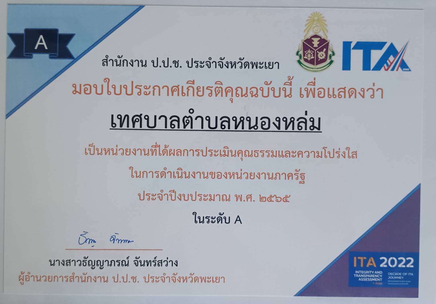 ชื่อเรื่อง : นายกเทศมนตรีตำบลหนองหล่ม รับมอบประกาศนียบัตรเชิดชูเกียรติให้ อปท. ที่มีผลการประเมินคุณธรรมและความโปร่งใสในการดำเนินงานของหน่วยงานภาครัฐ ITA ประจำปีงบประมาณ พ.ศ.2565