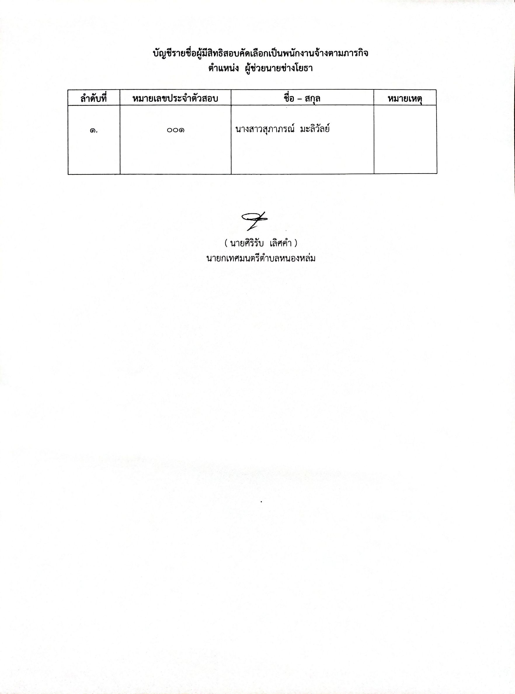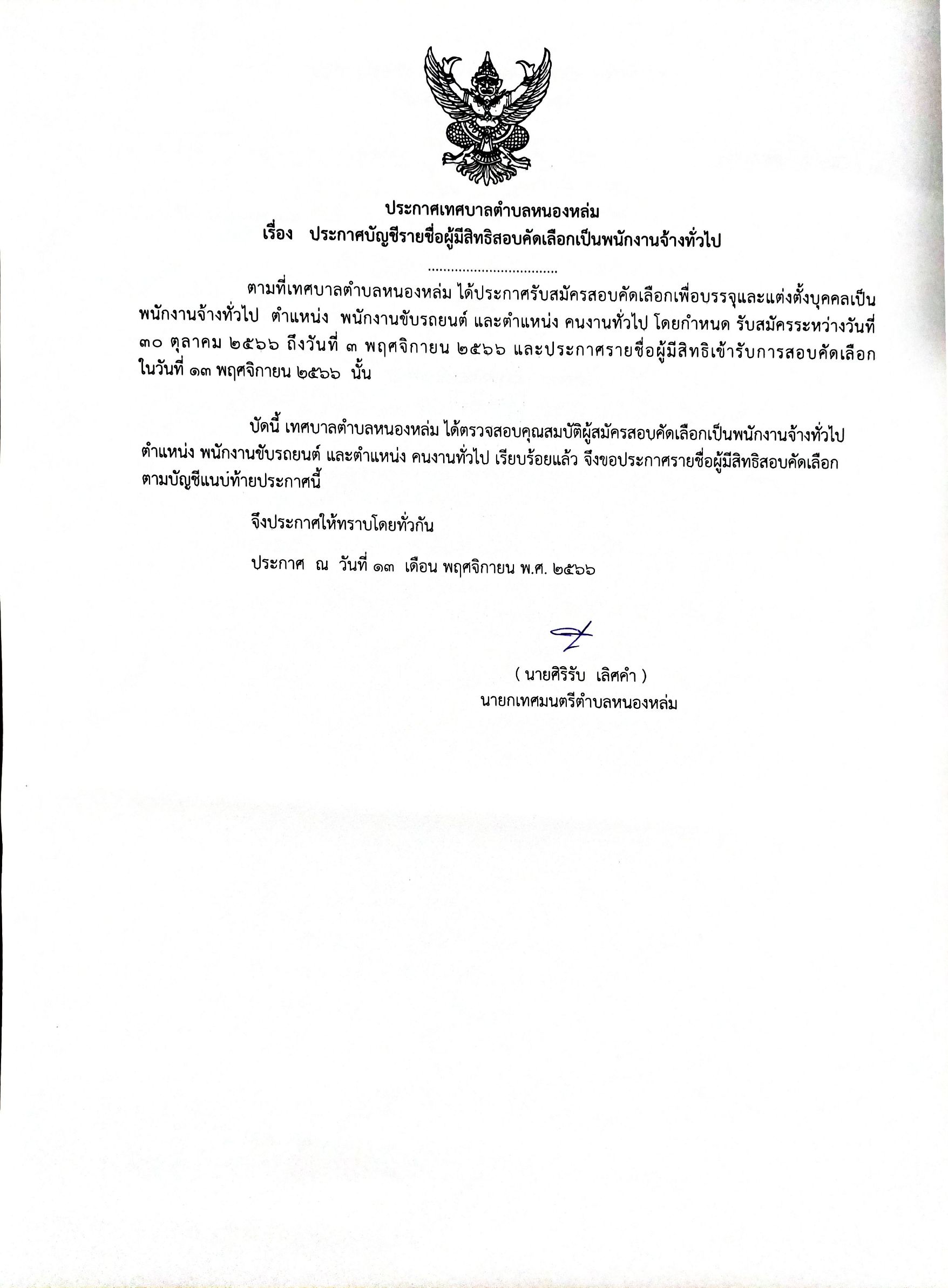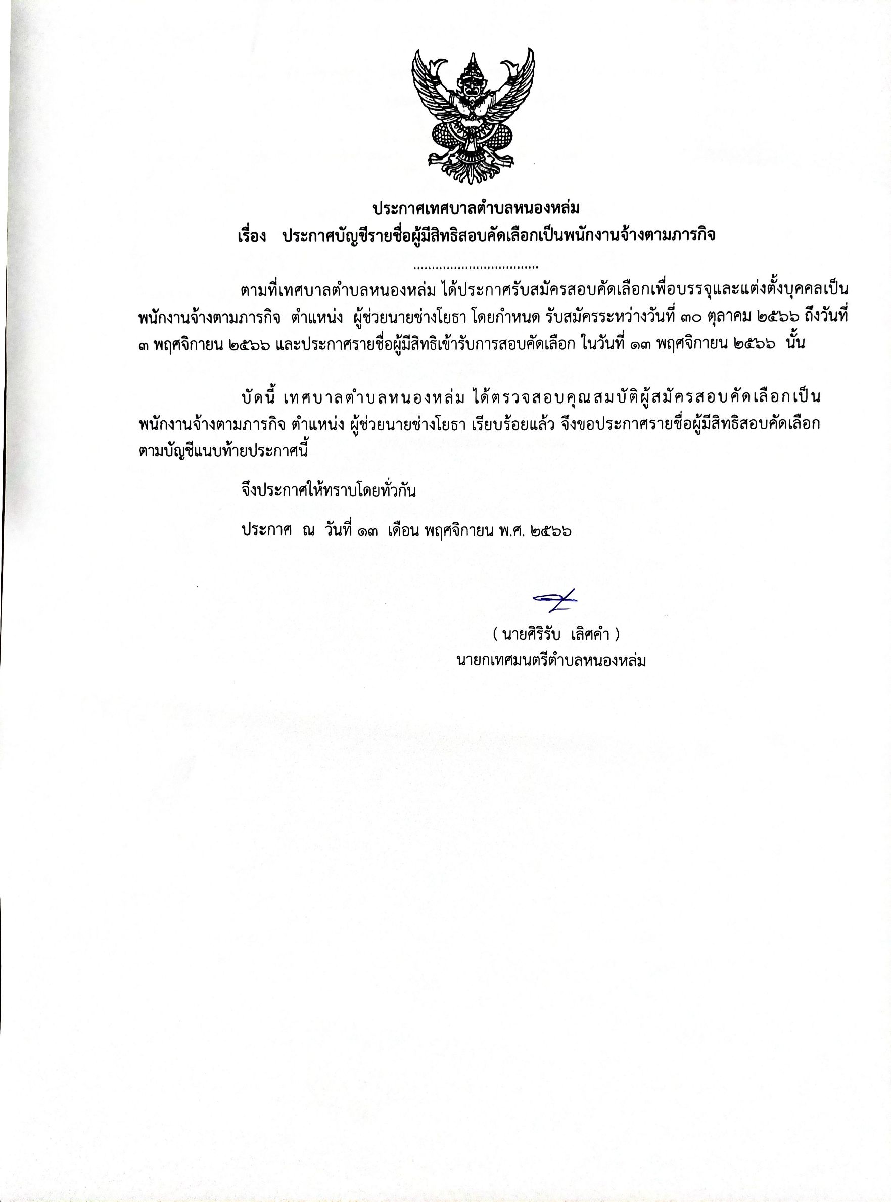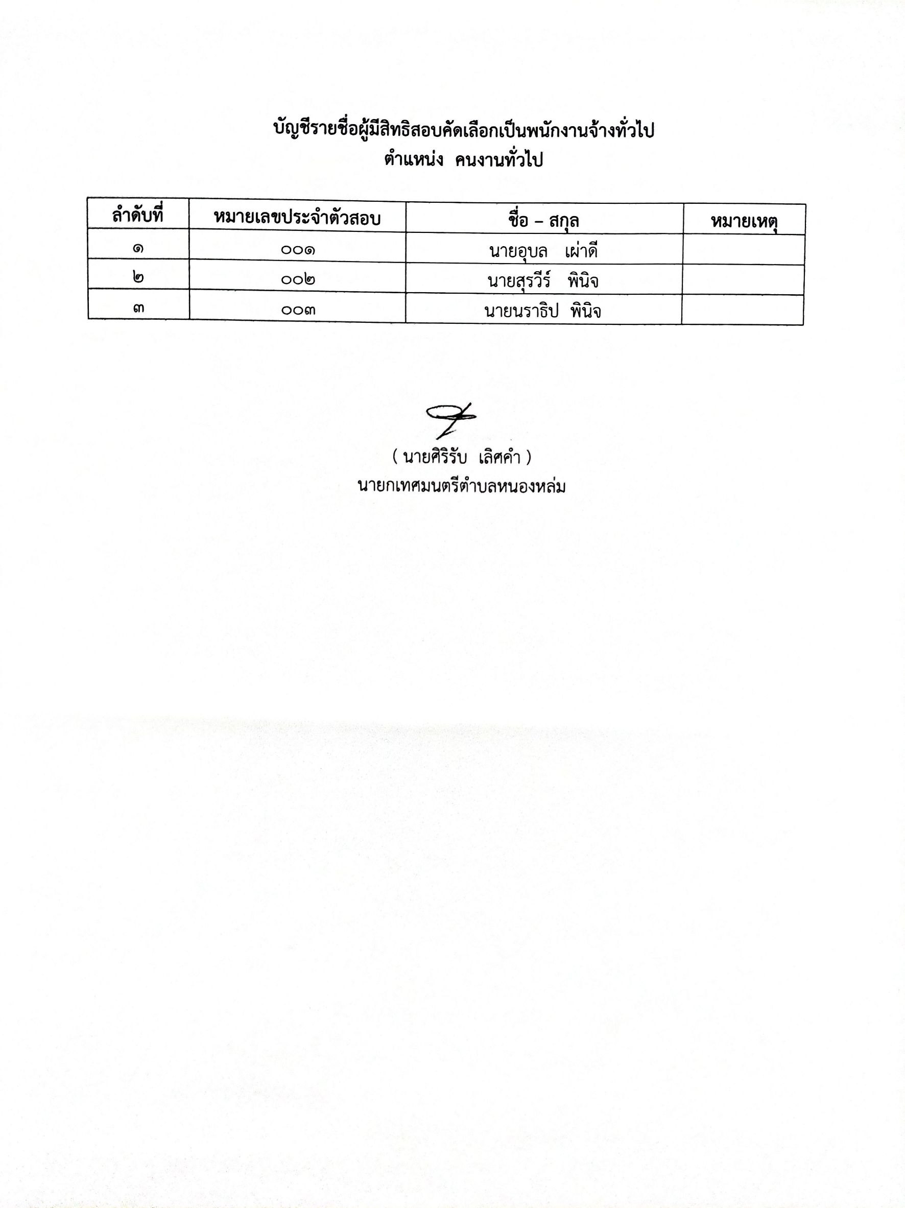 ประชาสัมพันธ์เทศบาลตำบลหนองหล่ม ประกาศรายชื่อผู้มีสิทธิสอบคัดเลือกเป็นพนักงานจ้างทั่วไปและพนักงานจ้างตามภารกิจ