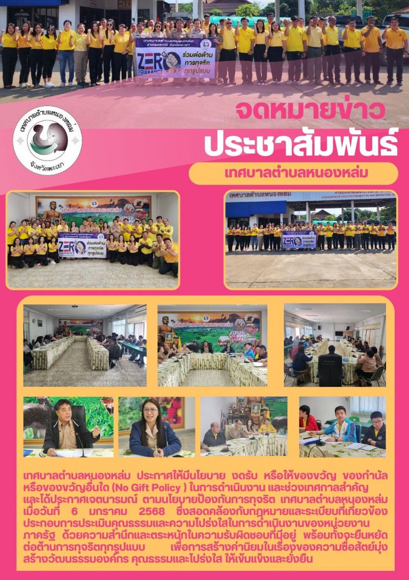 รายละเอียด : เทศบาลตำบลหนองหล่ม ประกาศให้มีนโยบาย งดรับ หรือให้ของขวัญ ของกำนัลหรือของขวัญอื่นใด (No Gift Policy ) ในการดำเนินงาน และช่วงเทศกาลสำคัญ และได้ประกาศเจตนารมณ์ ตามนโยบายป้องกันการทุจริต เทศบาลตำบลหนองหล่ม เมื่อวันที่ 6 มกราคม 2568 ซึ่งสอดคล้องกับกฎหมายและระเบียบที่เกี่ยวข้องประกอบการประเมินคุณธรรมและความโปร่งใสในการดำเนินงานของหน่วยงานภาครัฐ ด้วยความสำนึกและตระหนักในความรับผิดชอบที่มีอยู่ พร้อมทั้งจะยืนหยัดต่อต้านการทุจริตทุกรูปแบบ เพื่อการสร้างค่านิยมในเรื่องของความซื่อสัตย์มุ่งสร้างวัฒนธรรมองค์กร คุณธรรมและโปร่งใส ให้เข้มแข็งและยั่งยืน