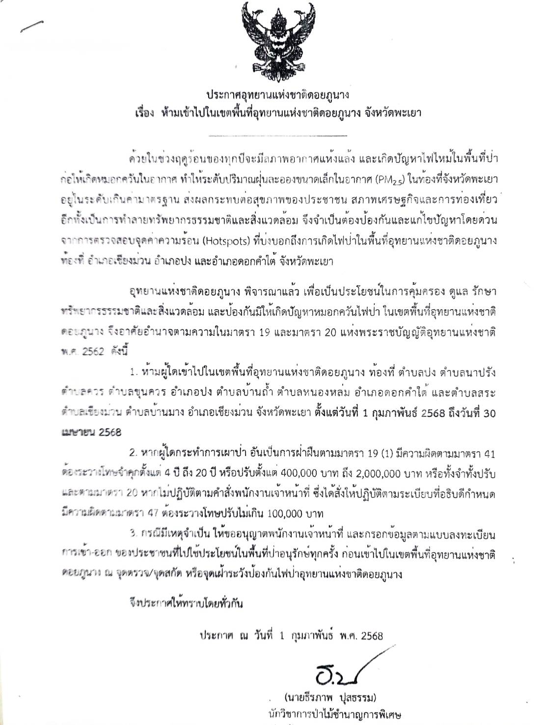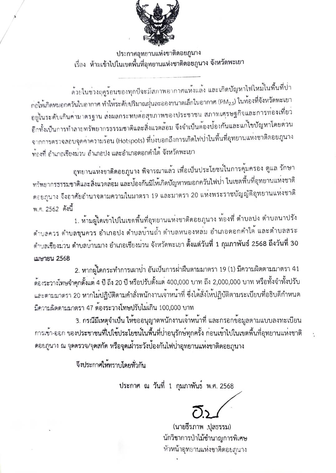 ระชาสัมพันธ์ เทศบาลตำบลหนองหล่ม เรื่องห้ามเข้าไปในเขตพื้นที่อุทยานแห่งชาติดอยภูนาง จังหวัดพะเยา